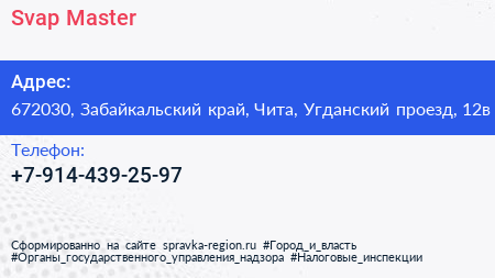 Svap Master по адресу 672030, Забайкальский край, Чита, Угданский проезд, 12в в дальнейшем Организация, размещена в следующих категориях: