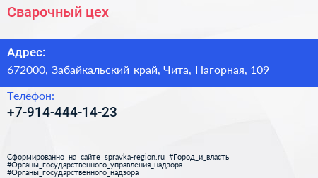 Сварочный цех по адресу 672000, Забайкальский край, Чита, Нагорная, 109 в дальнейшем Организация, размещена в следующих категориях: