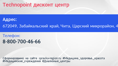 Technopoint, дисконт-центр по адресу 672049, Забайкальский край, Чита, Царский микрорайон, 4 в дальнейшем Организация, размещена в следующих категориях: