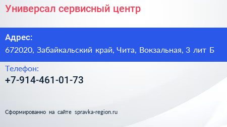 Универсал, сервисный центр по адресу 672020, Забайкальский край, Чита, Вокзальная, 3 лит Б в дальнейшем Организация, размещена в следующих категориях: