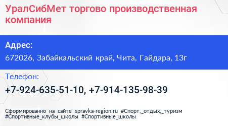 УралСибМет, торгово-производственная компания по адресу 672026, Забайкальский край, Чита, Гайдара, 13г в дальнейшем Организация, размещена в следующих категориях: