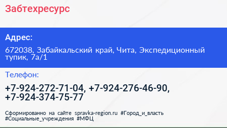 Забтехресурс по адресу 672038, Забайкальский край, Чита, Экспедиционный тупик, 7а/1 в дальнейшем Организация, размещена в следующих категориях: