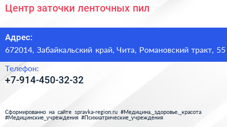 Центр заточки ленточных пил по адресу 672014, Забайкальский край, Чита, Романовский тракт, 55 в дальнейшем Организация, размещена в следующих категориях: