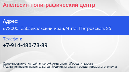 Апельсин, полиграфический центр по адресу 672000, Забайкальский край, Чита, Петровская, 35 в дальнейшем Организация, размещена в следующих категориях: