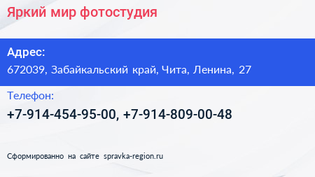 Яркий мир, фотостудия по адресу 672039, Забайкальский край, Чита, Ленина, 27 в дальнейшем Организация, размещена в следующих категориях: