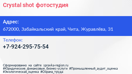 Crystal shot, фотостудия по адресу 672000, Забайкальский край, Чита, Журавлёва, 31 в дальнейшем Организация, размещена в следующих категориях: