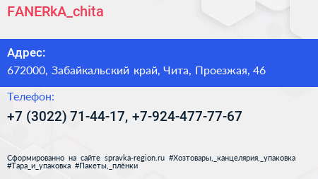 FANERkA_chita по адресу 672000, Забайкальский край, Чита, Проезжая, 46 в дальнейшем Организация, размещена в следующих категориях: