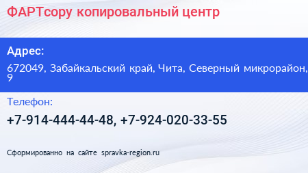ФАРТcopy, копировальный центр по адресу 672049, Забайкальский край, Чита, Северный микрорайон, 9 в дальнейшем Организация, размещена в следующих категориях: