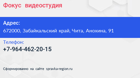 Фокус+, видеостудия по адресу 672000, Забайкальский край, Чита, Анохина, 91 в дальнейшем Организация, размещена в следующих категориях: