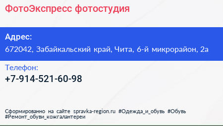 ФотоЭкспресс, фотостудия по адресу 672042, Забайкальский край, Чита, 6-й микрорайон, 2а в дальнейшем Организация, размещена в следующих категориях: