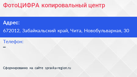 ФотоЦИФРА, копировальный центр по адресу 672012, Забайкальский край, Чита, Новобульварная, 30 в дальнейшем Организация, размещена в следующих категориях: