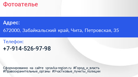 Фотоателье по адресу 672000, Забайкальский край, Чита, Петровская, 35 в дальнейшем Организация, размещена в следующих категориях: