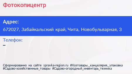 Фотокопицентр по адресу 672027, Забайкальский край, Чита, Новобульварная, 3 в дальнейшем Организация, размещена в следующих категориях: