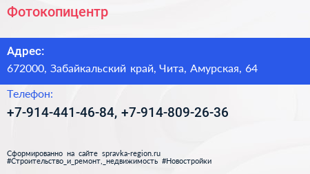 Фотокопицентр по адресу 672000, Забайкальский край, Чита, Амурская, 64 в дальнейшем Организация, размещена в следующих категориях: