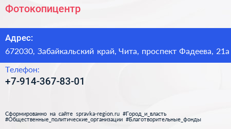 Фотокопицентр по адресу 672030, Забайкальский край, Чита, проспект Фадеева, 21а в дальнейшем Организация, размещена в следующих категориях: