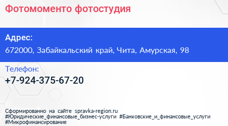 Фотомоменто, фотостудия по адресу 672000, Забайкальский край, Чита, Амурская, 98 в дальнейшем Организация, размещена в следующих категориях: