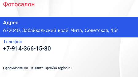Фотосалон по адресу 672040, Забайкальский край, Чита, Советская, 15г в дальнейшем Организация, размещена в следующих категориях: