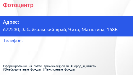 Фотоцентр по адресу 672530, Забайкальский край, Чита, Матюгина, 168Б в дальнейшем Организация, размещена в следующих категориях: