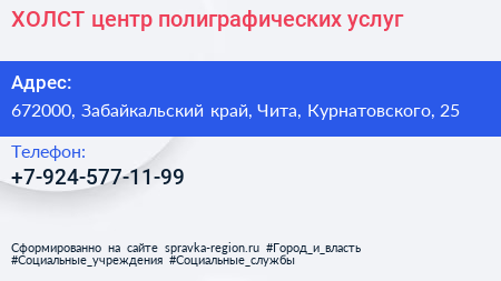 ХОЛСТ, центр полиграфических услуг по адресу 672000, Забайкальский край, Чита, Курнатовского, 25 в дальнейшем Организация, размещена в следующих категориях: