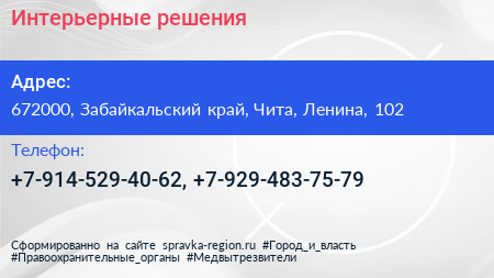 Интерьерные решения по адресу 672000, Забайкальский край, Чита, Ленина, 102 в дальнейшем Организация, размещена в следующих категориях: