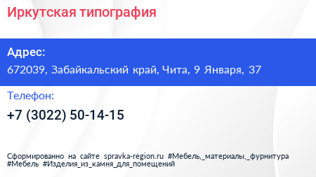Иркутская типография по адресу 672039, Забайкальский край, Чита, 9 Января, 37 в дальнейшем Организация, размещена в следующих категориях: