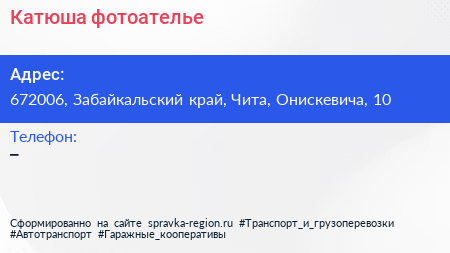 Катюша, фотоателье по адресу 672006, Забайкальский край, Чита, Онискевича, 10 в дальнейшем Организация, размещена в следующих категориях: