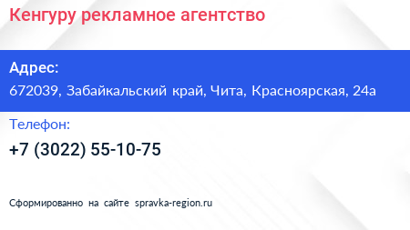 Кенгуру, рекламное агентство по адресу 672039, Забайкальский край, Чита, Красноярская, 24а в дальнейшем Организация, размещена в следующих категориях:
