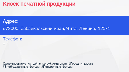 Киоск печатной продукции по адресу 672000, Забайкальский край, Чита, Ленина, 125/1 в дальнейшем Организация, размещена в следующих категориях: