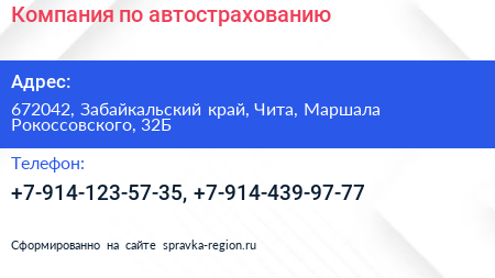 Компания по автострахованию по адресу 672042, Забайкальский край, Чита, Маршала Рокоссовского, 32Б в дальнейшем Организация, размещена в следующих категориях: