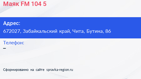 Маяк, FM 104.5 по адресу 672027, Забайкальский край, Чита, Бутина, 86 в дальнейшем Организация, размещена в следующих категориях: