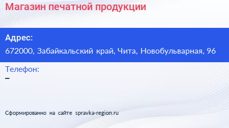 Магазин печатной продукции по адресу 672000, Забайкальский край, Чита, Новобульварная, 96 в дальнейшем Организация, размещена в следующих категориях:
