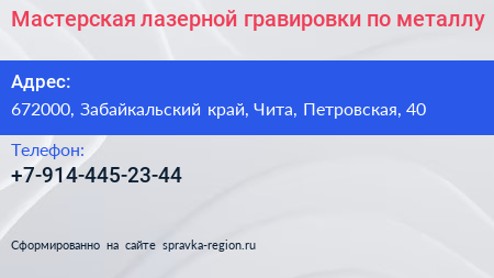 Мастерская лазерной гравировки по металлу по адресу 672000, Забайкальский край, Чита, Петровская, 40 в дальнейшем Организация, размещена в следующих категориях: