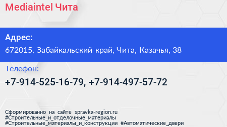 Mediaintel-Чита по адресу 672015, Забайкальский край, Чита, Казачья, 38 в дальнейшем Организация, размещена в следующих категориях:
