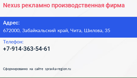 Nexus, рекламно-производственная фирма по адресу 672000, Забайкальский край, Чита, Шилова, 35 в дальнейшем Организация, размещена в следующих категориях: