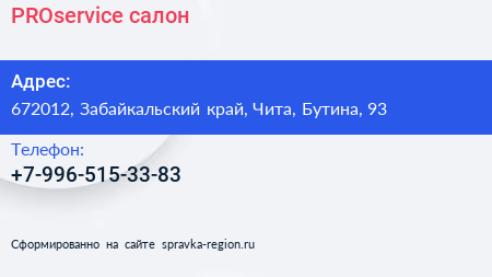 PROservice, салон по адресу 672012, Забайкальский край, Чита, Бутина, 93 в дальнейшем Организация, размещена в следующих категориях: