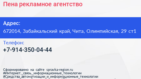 Пена, рекламное агентство по адресу 672014, Забайкальский край, Чита, Олимпийская, 29 ст1 в дальнейшем Организация, размещена в следующих категориях:
