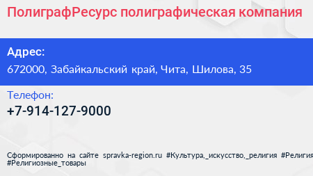 ПолиграфРесурс, полиграфическая компания по адресу 672000, Забайкальский край, Чита, Шилова, 35 в дальнейшем Организация, размещена в следующих категориях: