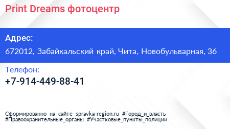 Print Dreams, фотоцентр по адресу 672012, Забайкальский край, Чита, Новобульварная, 36 в дальнейшем Организация, размещена в следующих категориях: