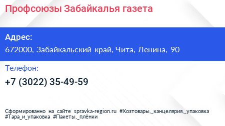 Профсоюзы Забайкалья, газета по адресу 672000, Забайкальский край, Чита, Ленина, 90 в дальнейшем Организация, размещена в следующих категориях: