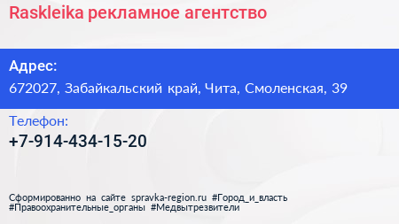 Raskleika, рекламное агентство по адресу 672027, Забайкальский край, Чита, Смоленская, 39 в дальнейшем Организация, размещена в следующих категориях: