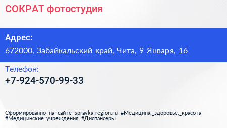 СОКРАТ, фотостудия по адресу 672000, Забайкальский край, Чита, 9 Января, 16 в дальнейшем Организация, размещена в следующих категориях: