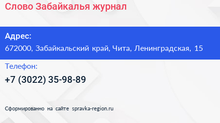 Слово Забайкалья, журнал по адресу 672000, Забайкальский край, Чита, Ленинградская, 15 в дальнейшем Организация, размещена в следующих категориях: