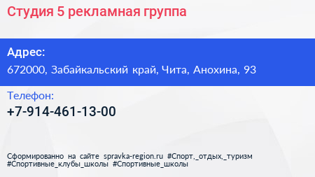 Студия-5, рекламная группа по адресу 672000, Забайкальский край, Чита, Анохина, 93 в дальнейшем Организация, размещена в следующих категориях: