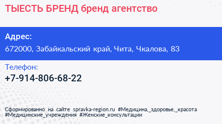 ТЫЕСТЬ БРЕНД, бренд-агентство по адресу 672000, Забайкальский край, Чита, Чкалова, 83 в дальнейшем Организация, размещена в следующих категориях: