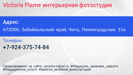 Victoria Flame, интерьерная фотостудия по адресу 672000, Забайкальский край, Чита, Ленинградская, 15а в дальнейшем Организация, размещена в следующих категориях: