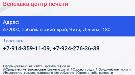 Вспышка, центр печати по адресу 672000, Забайкальский край, Чита, Ленина, 130 в дальнейшем Организация, размещена в следующих категориях: