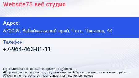 Website75, веб-студия по адресу 672039, Забайкальский край, Чита, Чкалова, 44 в дальнейшем Организация, размещена в следующих категориях: