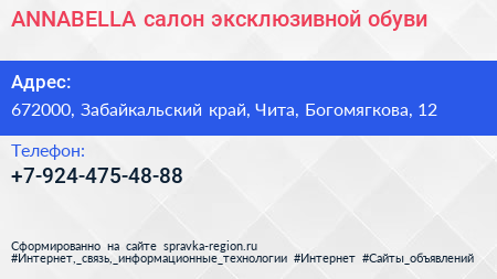 ANNABELLA, салон эксклюзивной обуви по адресу 672000, Забайкальский край, Чита, Богомягкова, 12 в дальнейшем Организация, размещена в следующих категориях: