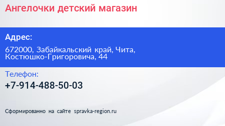 Ангелочки, детский магазин по адресу 672000, Забайкальский край, Чита, Костюшко-Григоровича, 44 в дальнейшем Организация, размещена в следующих категориях: