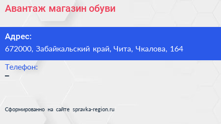 Авантаж, магазин обуви по адресу 672000, Забайкальский край, Чита, Чкалова, 164 в дальнейшем Организация, размещена в следующих категориях: